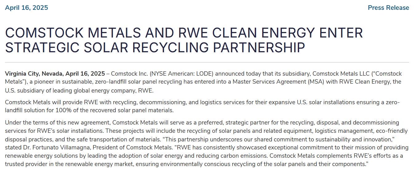 Source: https://comstock.inc/press-release/comstock-metals-and-rwe-clean-energy-enter-strategic-solar-recycling-partnership/