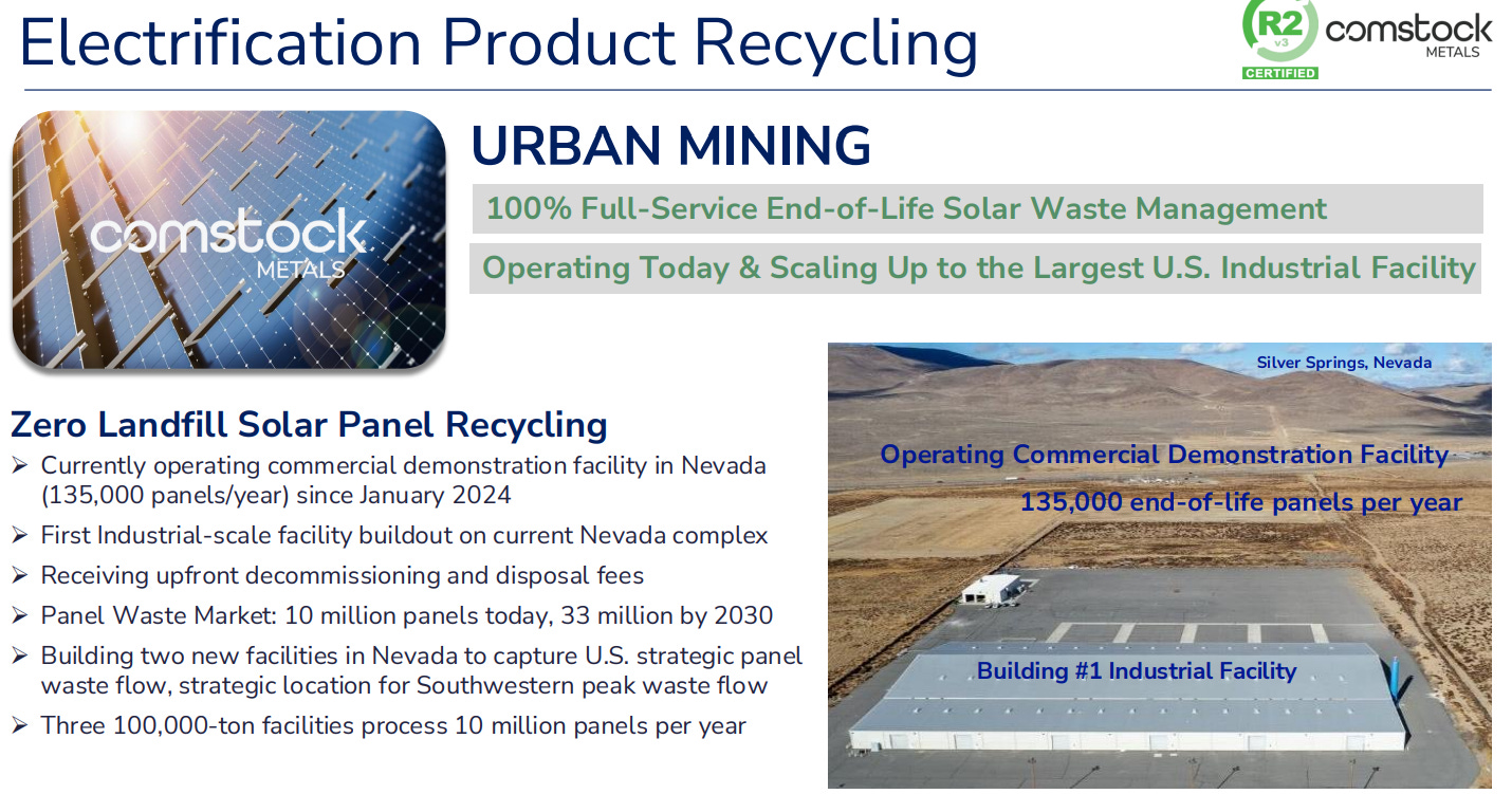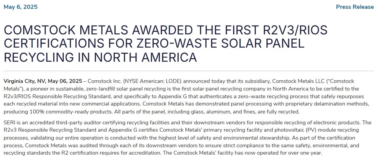 Source: https://comstock.inc/press-release/comstock-metals-awarded-the-first-r2v3-rios-certifications-for-zero-waste-solar-panel-recycling-in-north-america/