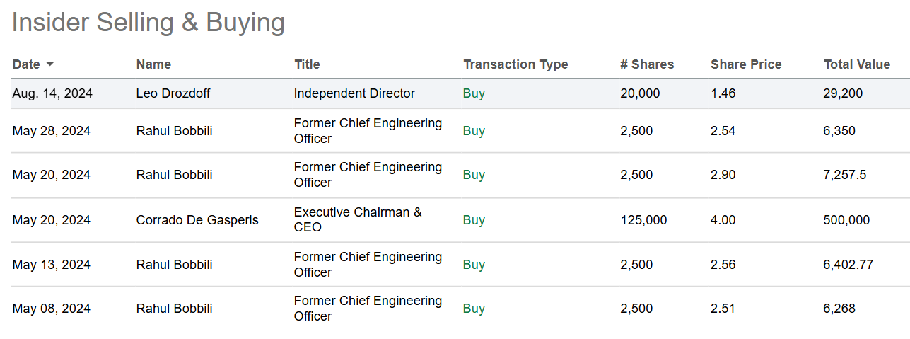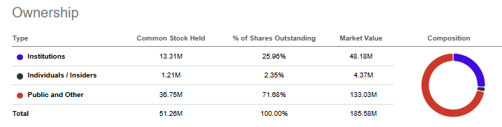 Insider ownership is quite low at 2.35%, though partly due to dilution from the aforementioned raise. It’s worth noting that the CEO bought 500k shares last year at a 4$ share price, and there has been no reported insider selling for years.