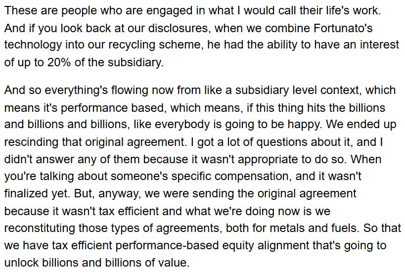 “20% of the equity going to the founders, which by the way is exactly what we did with Comtock metals, Fortunado, and the team. 20%.”