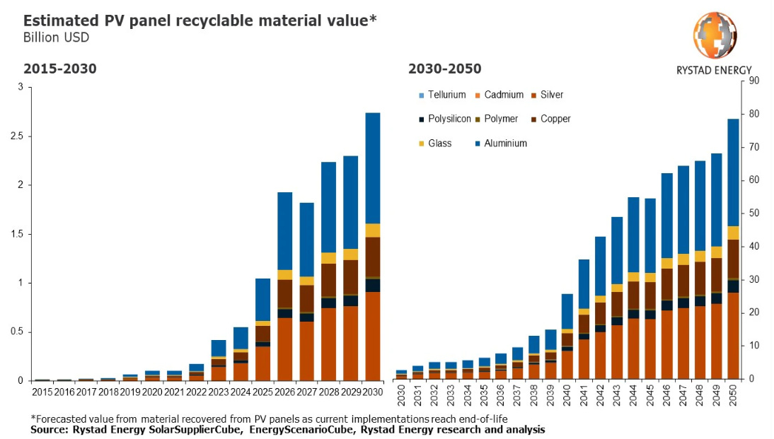 The Rystad graph only shows the value from the recyclable materials, of which silver and aluminium are the biggest contributors, but the bigger share of the recycler’s revenue comes from the “tipping fee”, which is what the recycler gets just from taking the waste.