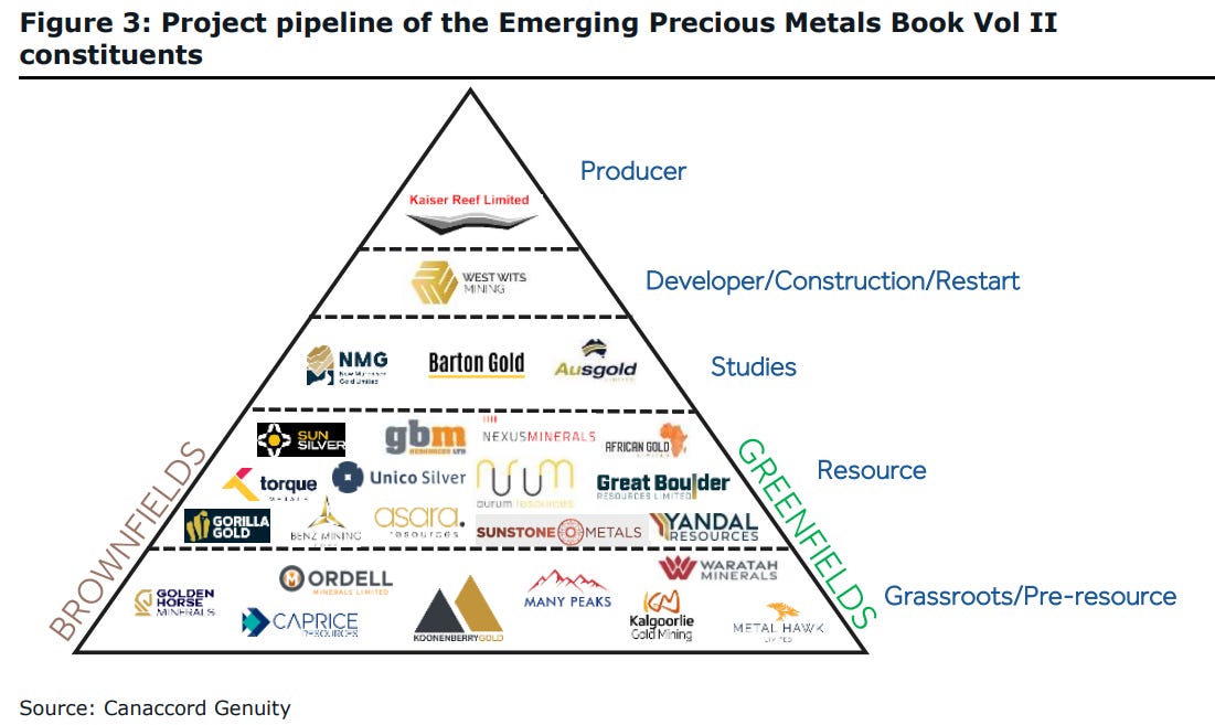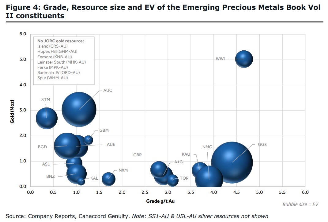 This is from Canacord’s The Emerging Precious Metals Book, Vol. II (Vol. 1 was published in 2024 and doesn’t include WWI), published on 12.5.2025, where they compare and highlight 26 precious metals companies exploring or planning to move into/increase production in the coming years.
