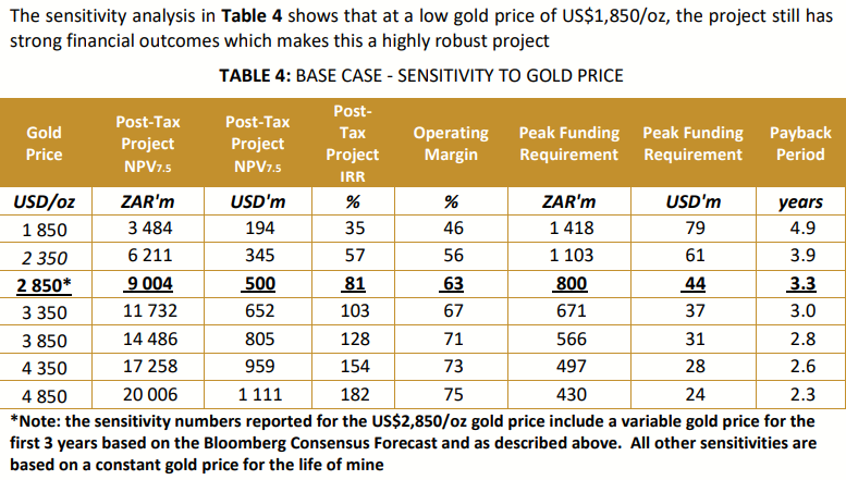 Due to the stock having a low valuation and the mine being low-cost and long LOM, this project is also successful at significantly lower gold prices. West Wits is not hedging at the moment, but being low cost offers some margin of safety if the gold price falls, if the company delivers operationally.