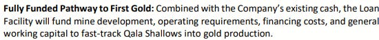 A day will come when I look up what NPV means, but it is not this day! At the current gold price of 3847$, the post-tax NPV is around $805 million USD. West Wits owns 74% so it is 0,74*805=595,7m USD for them. This is just for Qala Shallows. The stage 1. This compares to a market cap of $ 120m USD, which is quite remarkable considering that this project is fully permitted, fully financed, and is on track to extract ore next month and to achieve the first gold pour in Q1 2026. You can find many junior mining companies trading at large discounts to their NPVs, but these situations are almost always paired with a lack of permits, a lack of financing, a long time until production, etc. A situation with a discount this large and production about to start, with all the roadblocks cleared, is rare.